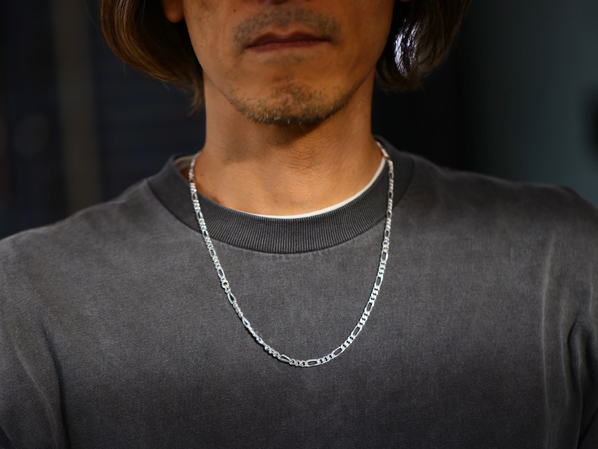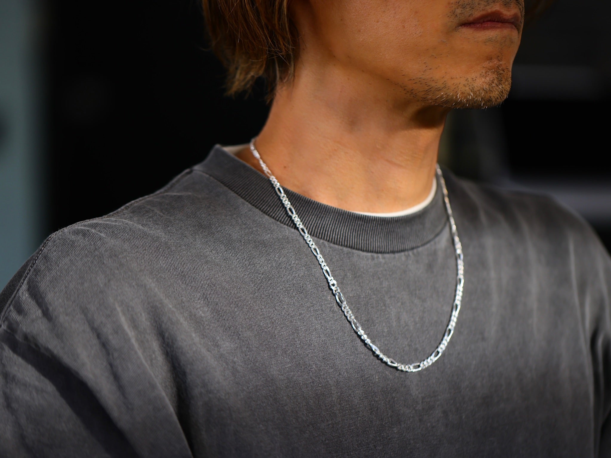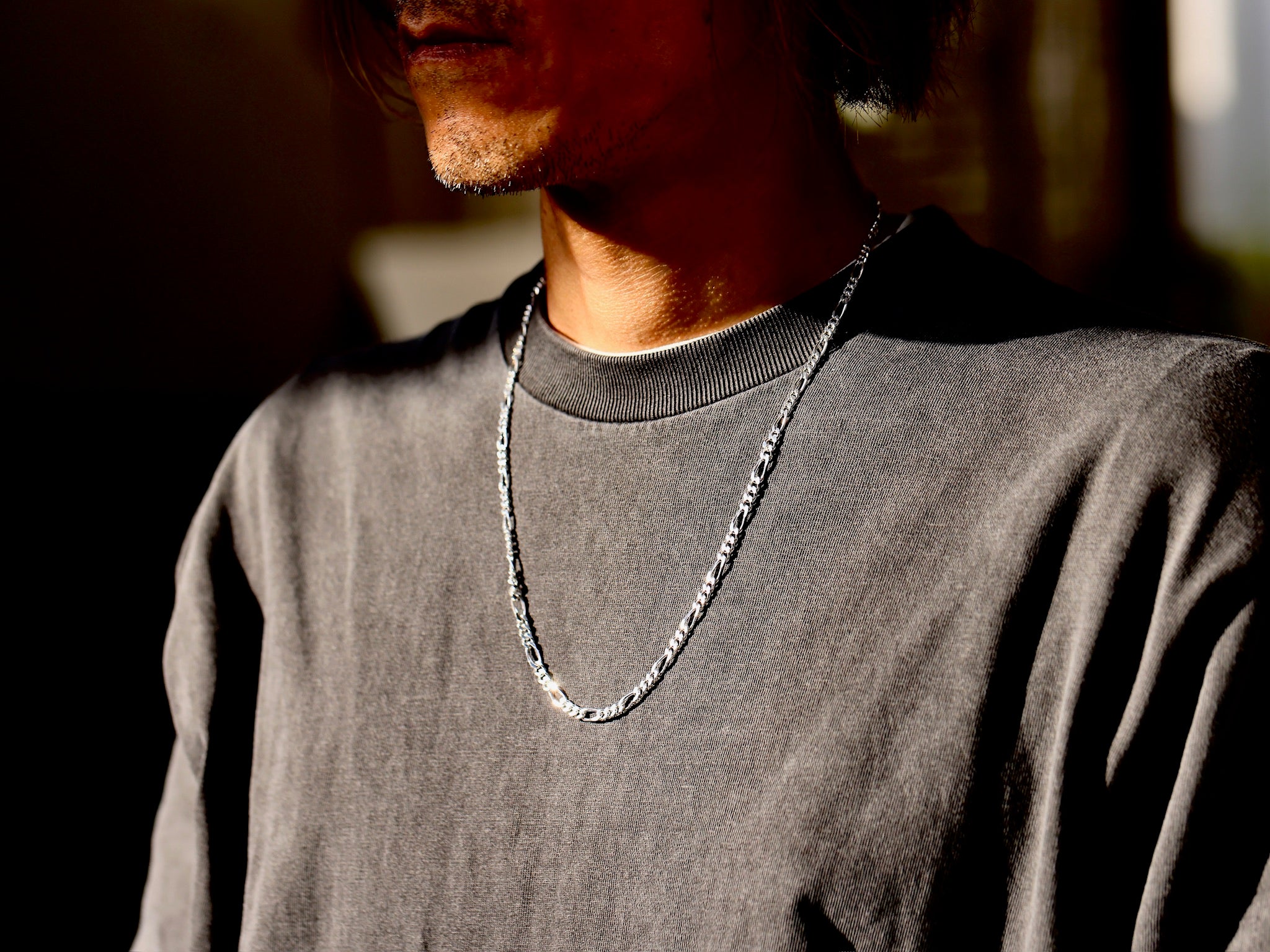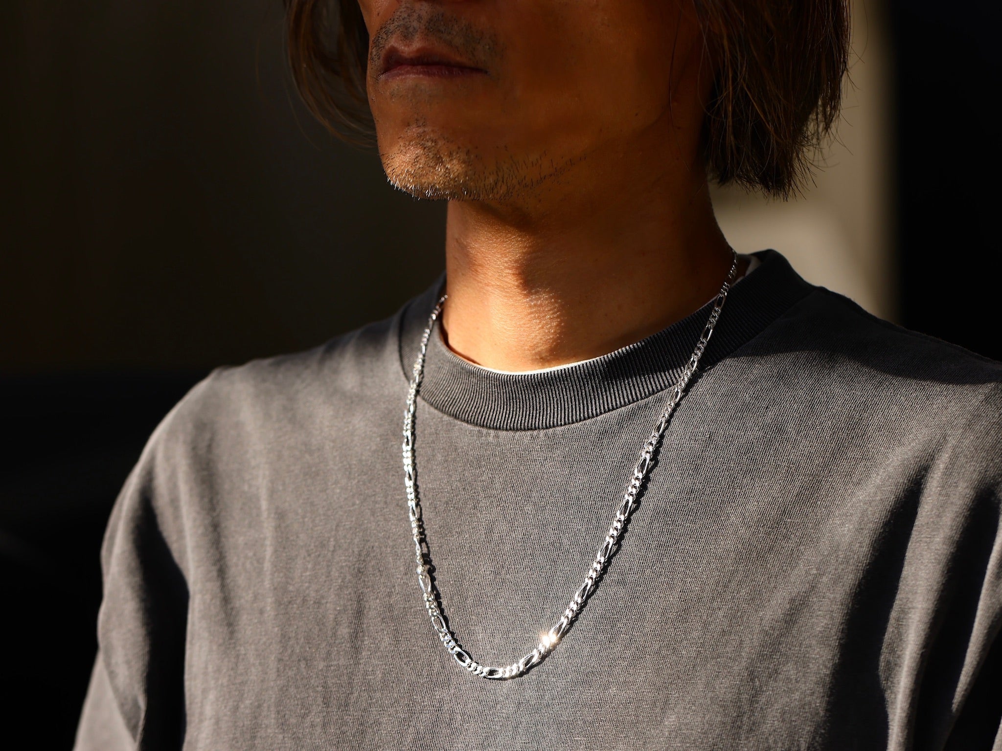 シームレスに繋がれたフィガロチェーンは、リズム感のあるデザインと光の反射で立体感と重厚感を演出。