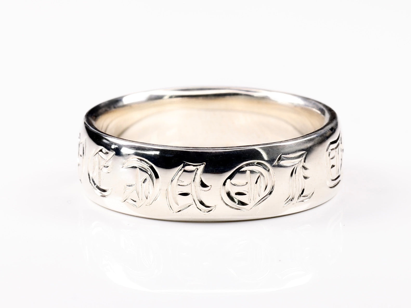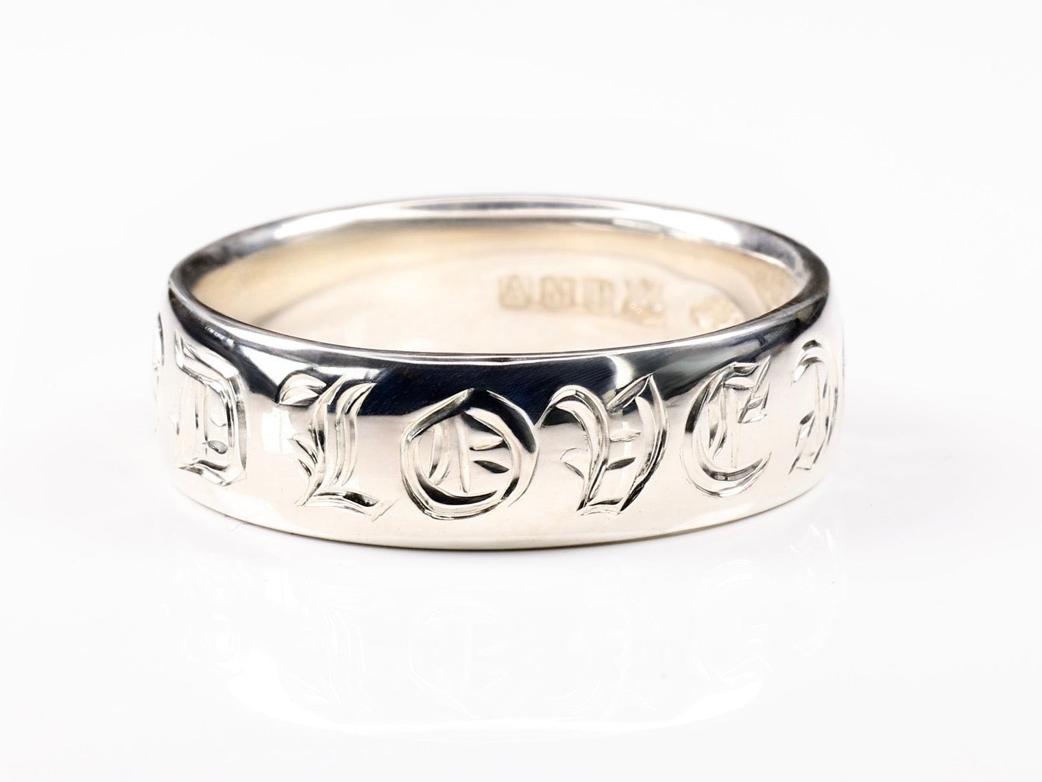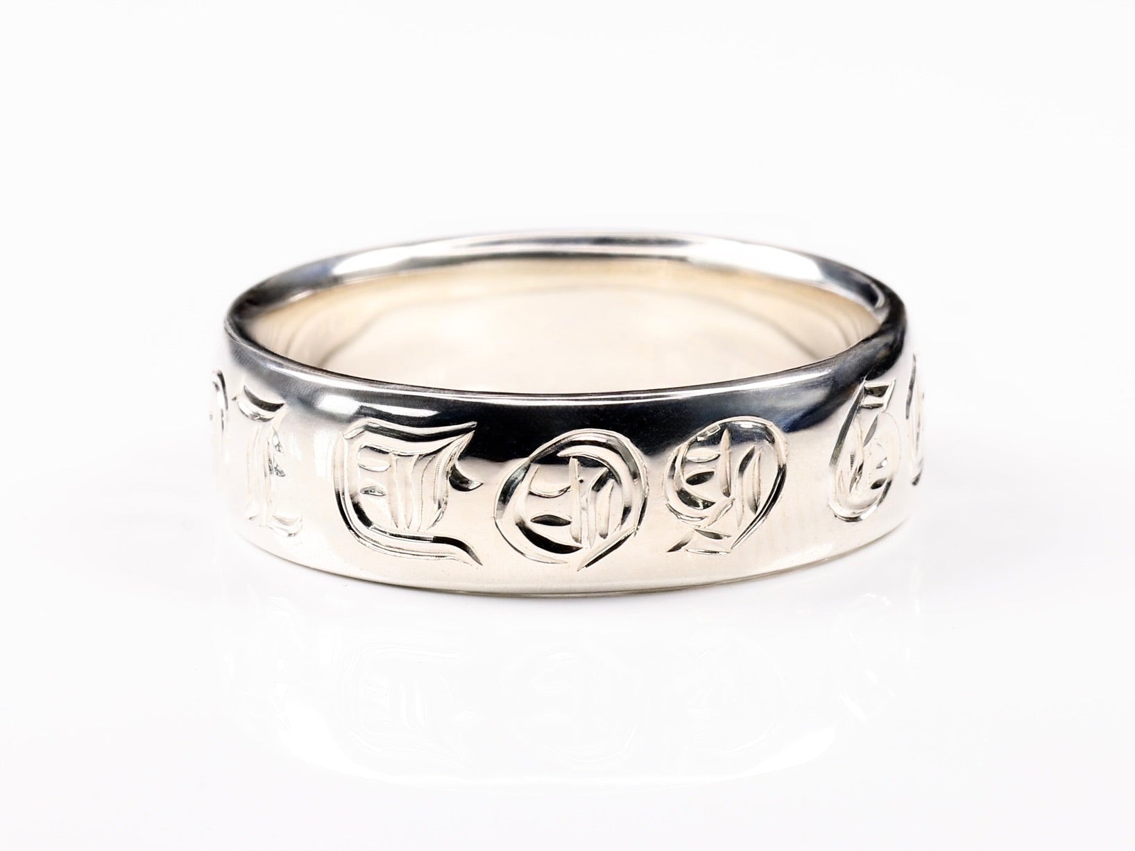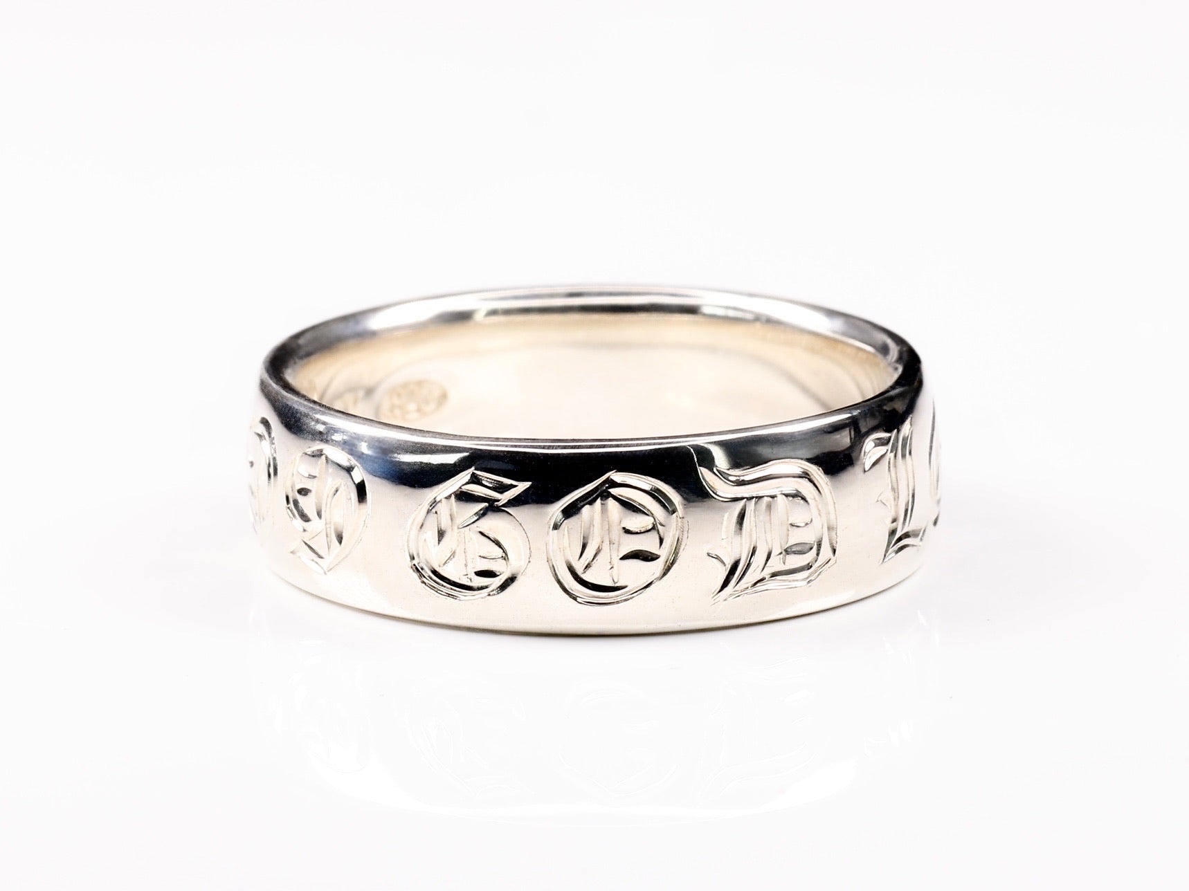 熟練の職人による手彫りタガネで刻まれる GOD LOVE のレタリングは リング表面をぐるりと囲むように GOD LOVE ƎꓥOꓶ ꓷOꓨ と施されています。