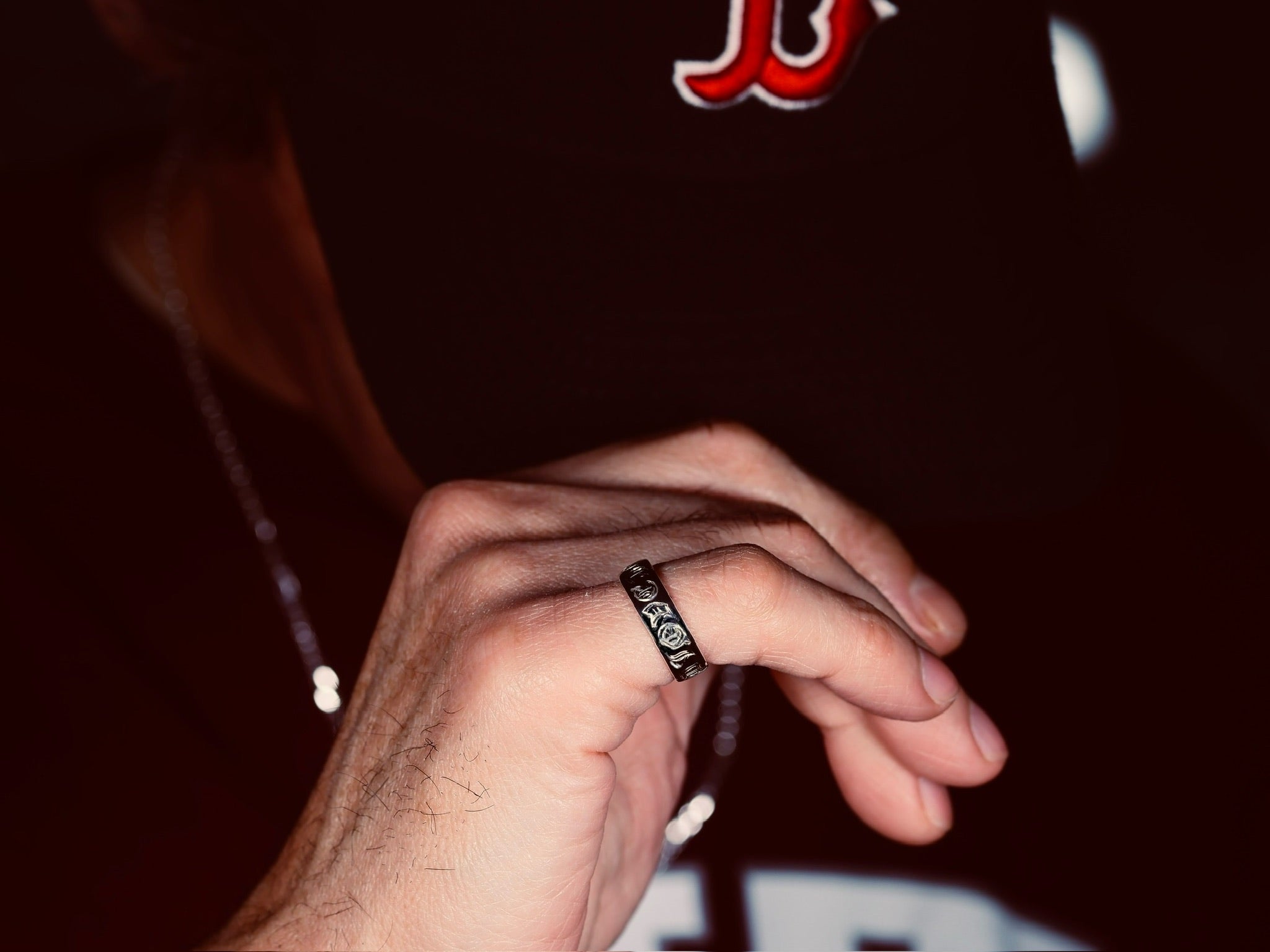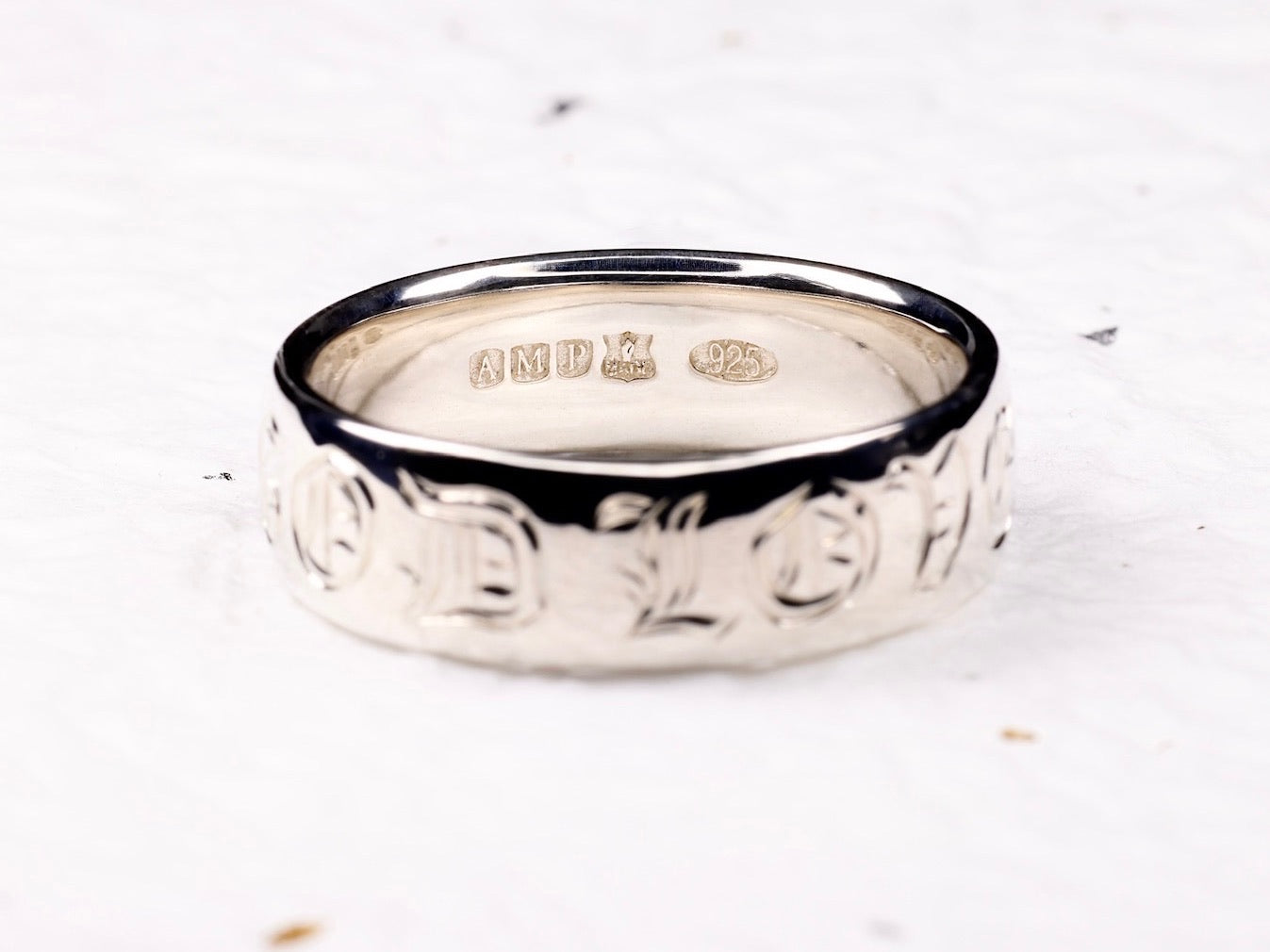 The GOD LOVE lettering, carved by hand with a chisel by skilled artisans, is engraved around the ring's surface as GOD LOVE ƎꓥOꓶ ꓷOꓨ.